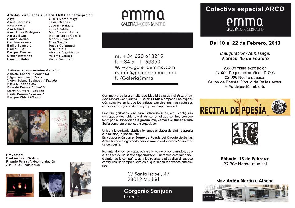 EMMA, Madrid, España | 11.02.13 – 22.03.13 Del 11 al 22 de Febrero con motivo de las grandes ferias de Arte en Madrid realizamos una exposición en la que los artistas de galeria junto con invitados se suman a la cita. Viernes inauguración con noche de Poesía. Teilen mit: Einen Link per E-Mail an einen Freund senden (Wird in neuem Fenster geöffnet) E-Mail Auf Facebook teilen (Wird in neuem Fenster geöffnet) Facebook Gefällt mir Wird geladen … Ähnliche Beiträge