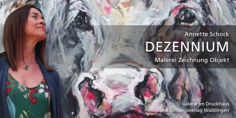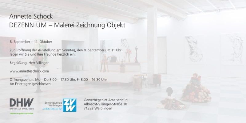 Jetzt folgt am Sonntag, den 8.9. 2019 um 11 Uhr die Eröffnung meiner Einzelausstellung DEZENNIUM im Zeitungsverlag und Druckhaus Waiblingen.