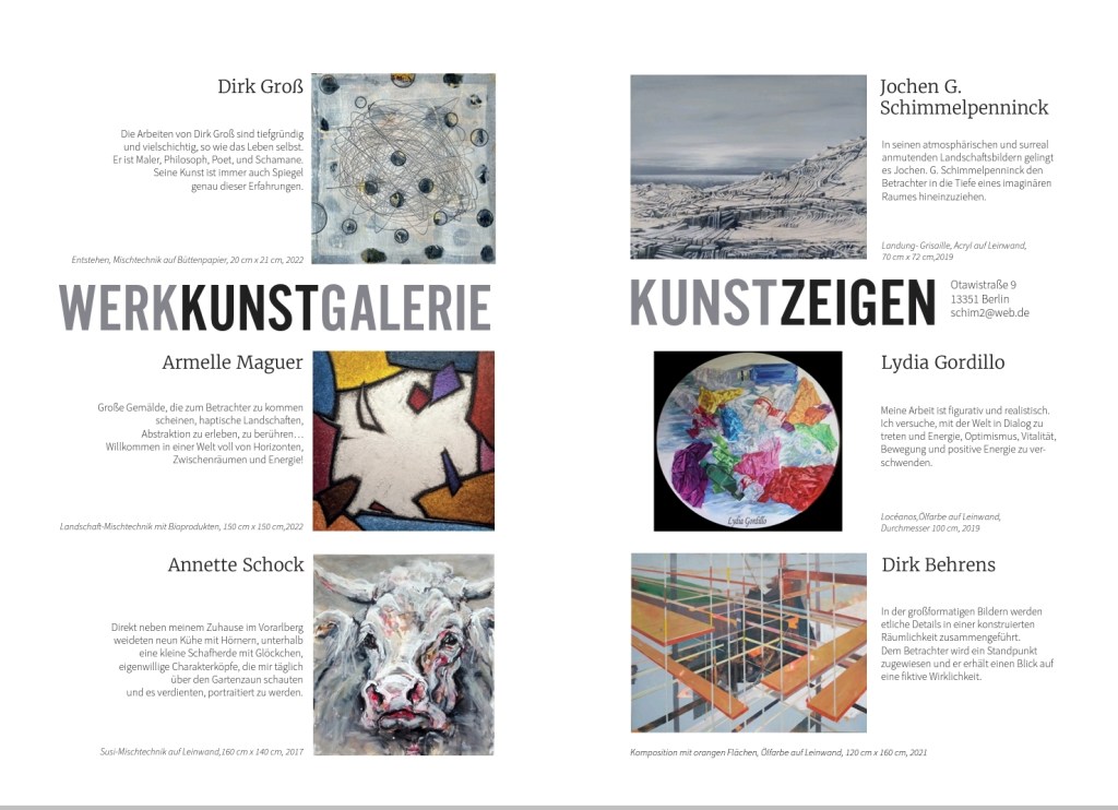 Ihr findet mich bei der „Werkkunstgalerie“ zusammen mit 4 weiteren Künstlern und meiner spanischen Künstlerfreundin und Kollegin Lydia Gordillo, die auch in der Collage des Titelbilds der Messe vertreten ist.