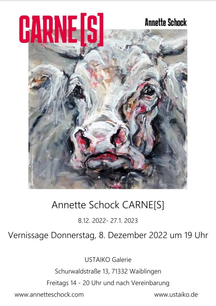 Am Donnerstag, den 8. Dezember 2022 um 19 Uhr findet in der USTAIKO Galerie in Waiblingen die Vernissage zu meiner Ausstellung CARNE[S] statt.
