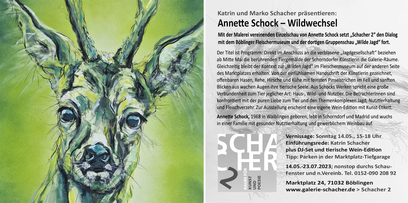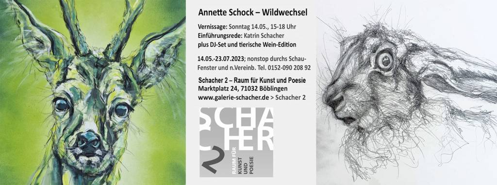 Am Sonntag, den 14. Mai um 15 Uhr findet die Vernissage zu meiner neuen Ausstellung WILDWECHSEL in der Galerie Schacher, Schacher 2 – Raum für Kunst und Poesie in Böblingen statt.
