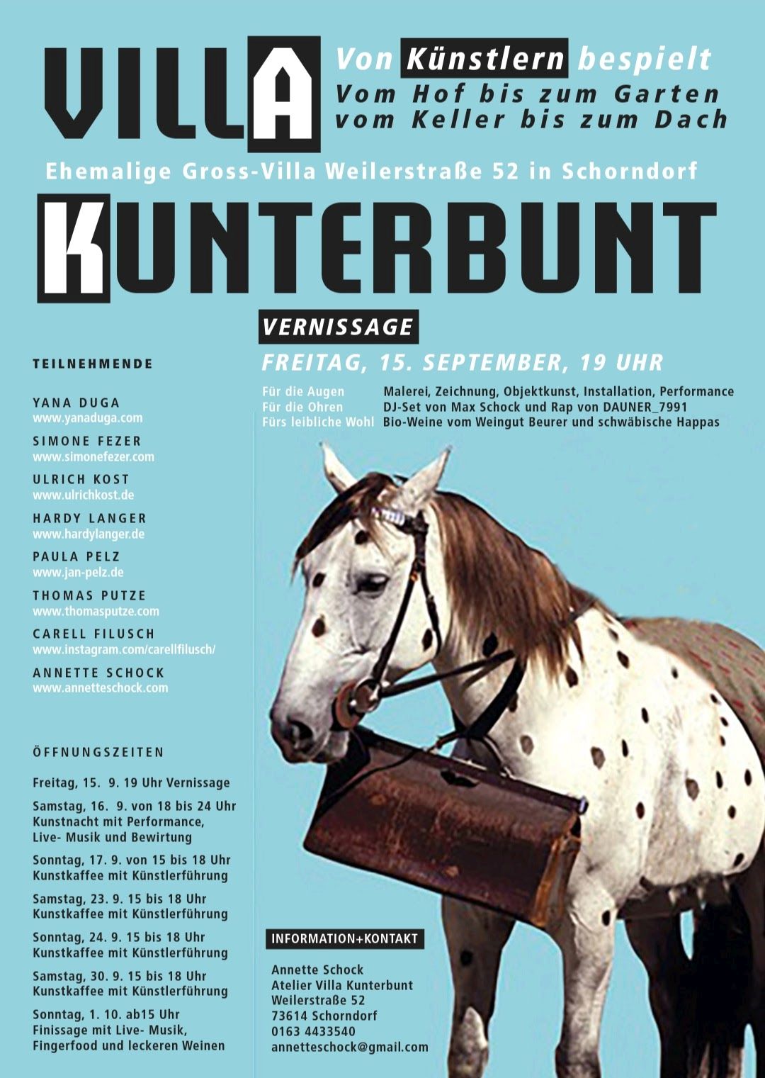 Am Freitag, den 15.September um 19 Uhr findet die Vernissage meines persönlichen Kunstprojekts in der VILLA KUNTERBUNT, meinem Atelier in Schorndorf statt: