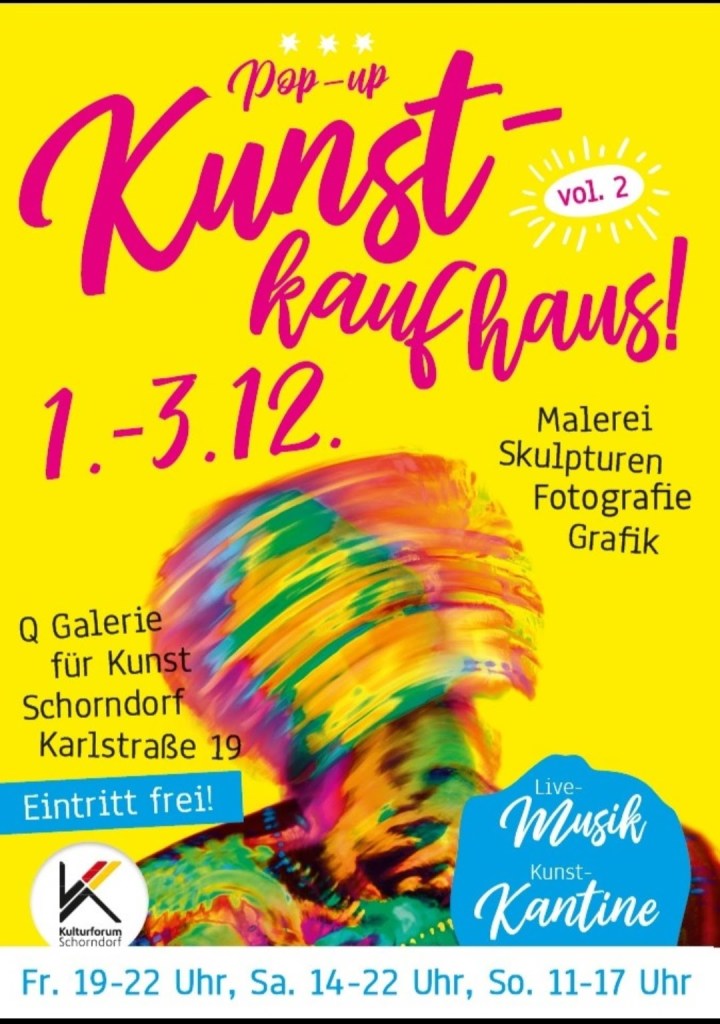 Am Freitag, den 1. Dezember startet um 19 Uhr das Kunstkaufhaus in der Q-Galerie in Schorndorf. Am Samstag dann sogar mit extra langen Öffnungszeiten von 14 bis 22 Uhr und Live-Musik, am Sonntag könnt ihr von 11 bis 17 Uhr bei uns vorbeischauen.